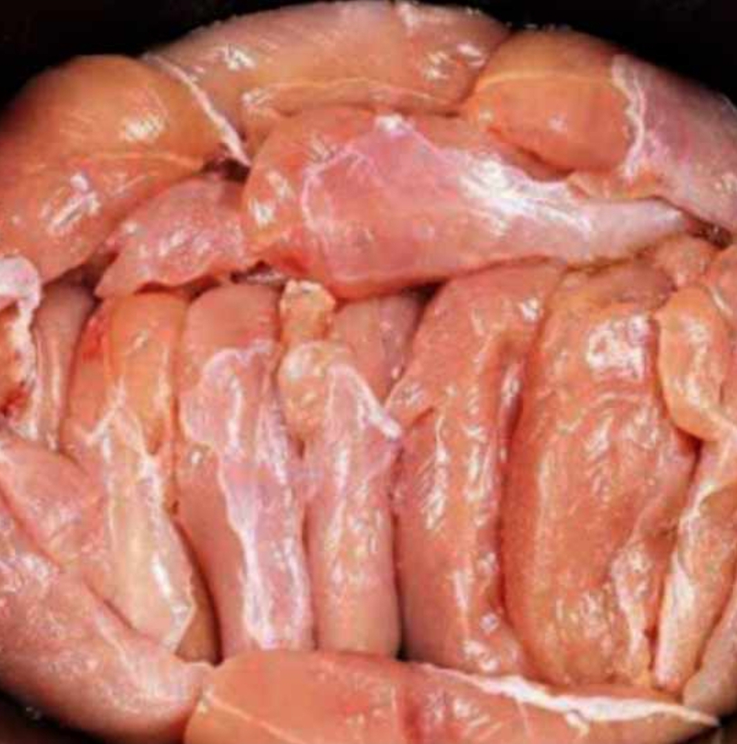 Arrange the chicken breasts in your slow cooker.
