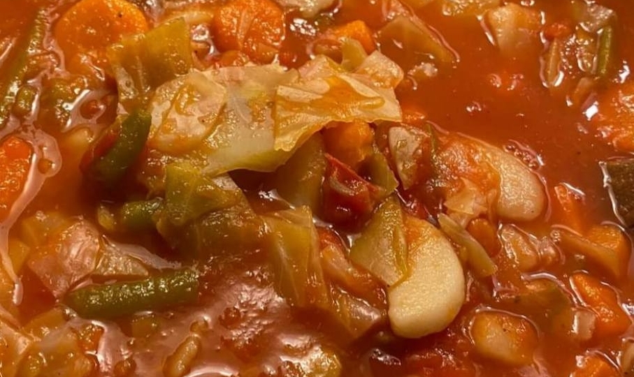 I simmer the soup on medium for about two to three hours until the cabbage softens and the broth cooks down and gets a bit thicker.