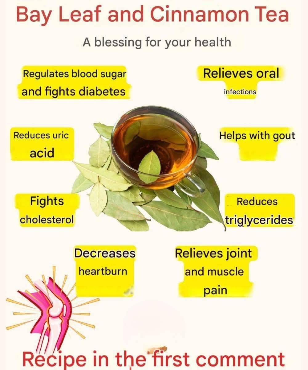 Bay leaf tea is an ancient beverage celebrated across cultures for its exceptional medicinal qualities. Made from the aromatic leaves of the Laurus nobilis tree, this soothing drink offers more than just comfort—it’s a natural source of compounds that promote both physical and mental well-being.If you’ve been feeling tired, low on energy, or simply want to strengthen your immune system naturally, bay leaf tea may be the perfect remedy. Below, you’ll discover its preparation method, health benefits, active compounds, and precautions for safe use.🌿 What Is Bay Leaf Tea?Bay leaf tea is prepared by boiling laurel leaves in water, often combined with cinnamon and honey to enhance both flavor and benefits. These leaves are rich in essential oils, antioxidants, vitamins, and minerals that support various bodily functions and protect against disease.🍵 How to Make Bay Leaf TeaIngredients:5 bay leaves (fresh or dried)1 cinnamon stick1 teaspoon of honey (optional)2 cups of waterPreparation:Rinse the bay leaves thoroughly.Bring 2 cups of water to a boil.Add the bay leaves and cinnamon stick.Simmer for 10 minutes over low heat.Remove from heat and let steep for 5 more minutes.Strain and sweeten with honey if desired.How to drink it:Enjoy one cup in the morning and another at night for seven days. Drink it warm to maximize absorption and relaxation.💚 Top Health Benefits of Bay Leaf Tea1. Reduces Stress and AnxietyThe calming compounds in bay leaves promote relaxation and help balance the nervous system, reducing tension and anxiety.2. Aids DigestionBay leaf tea stimulates gastric juices, easing bloating, indigestion, and constipation.3. Strengthens ImmunityLoaded with antioxidants and vitamin C, it helps the body fight infections and strengthens its natural defenses.4. Fights Cold and Flu SymptomsIts expectorant and antibacterial properties relieve nasal congestion, cough, and sore throat.5. Improves CirculationBay leaf tea promotes healthy blood flow, helping prevent cardiovascular issues and improving overall vitality.6. Reduces InflammationIdeal for those with arthritis or joint pain, thanks to its anti-inflammatory compounds.7. Balances Blood Sugar LevelsBay leaves may help stabilize glucose levels, making this tea beneficial for people managing diabetes.8. Acts as an ExpectorantIt helps eliminate mucus from the respiratory tract and eases breathing.9. Relieves Menstrual PainThe tea relaxes uterine muscles, reducing cramps and discomfort during menstruation.10. Detoxifies the BodyBy promoting urine production, it helps flush out toxins and supports kidney health.11. Enhances Sleep QualityIts mild sedative effect helps you fall asleep faster and enjoy deeper rest.12. Protects the LiverSupports liver detoxification processes and overall function.13. Boosts Memory and FocusBay leaf compounds support brain health, improving concentration and cognitive performance.14. Prevents Urinary InfectionsIts antimicrobial and diuretic properties reduce the risk of urinary tract infections.15. Regulates MetabolismBay leaf tea aids in fat breakdown and improves digestion efficiency.16. Relieves HeadachesThe tea’s subtle analgesic properties can soothe headaches and migraines.17. Strengthens HairPromotes scalp health, reduces dandruff, and prevents hair loss.18. Freshens BreathBay leaf tea combats bacteria responsible for bad breath, leaving your mouth clean and fresh.19. Slows AgingRich in antioxidants that neutralize free radicals, it helps maintain youthful skin.20. Reduces FatigueRevitalizes the body, improving energy levels and mental clarity.🌱 Properties of Each IngredientBay Leaves:Contain vitamins A and C, potassium, calcium, and iron. Offer antioxidant, antimicrobial, and anti-inflammatory benefits that support digestion and immunity.Cinnamon:Rich in cinnamaldehyde—a compound known for its antimicrobial, antioxidant, and blood-sugar-regulating effects.Honey:A natural sweetener with antibacterial properties that soothes sore throats and enhances immune defense.⚠️ Precautions and WarningsWhile bay leaf tea is natural, moderation is key:Pregnancy and Breastfeeding: Avoid excessive consumption—it may stimulate uterine contractions.Allergies: Consult your doctor if you are allergic to plants from the Lauraceae family.Medication Interactions: May affect the action of anticoagulants and diabetes medications.Long-term Use: Do not drink it continuously for more than seven days without medical advice.🌼 Extra TipsAlways use culinary bay leaves (not ornamental varieties).Pair the tea with a balanced diet and sufficient rest for best results.If you have chronic health conditions, consult a healthcare professional before adding it to your daily routine.🧘♀️ ConclusionBay leaf tea is a simple, affordable, and highly effective way to enhance overall health. From calming the mind and easing digestion to boosting immunity and improving sleep, its benefits are extensive and well-rounded.Incorporate this aromatic herbal infusion into your wellness routine for a few days and experience its natural healing touch. Listen to your body, enjoy its comforting flavor, and let bay leaf tea restore your balance—naturally and deliciously.Bay leaf tea is an ancient beverage celebrated across cultures for its exceptional medicinal qualities. Made from the aromatic leaves of the Laurus nobilis tree, this soothing drink offers more than just comfort—it’s a natural source of compounds that promote both physical and mental well-being.If you’ve been feeling tired, low on energy, or simply want to strengthen your immune system naturally, bay leaf tea may be the perfect remedy. Below, you’ll discover its preparation method, health benefits, active compounds, and precautions for safe use.🌿 What Is Bay Leaf Tea?Bay leaf tea is prepared by boiling laurel leaves in water, often combined with cinnamon and honey to enhance both flavor and benefits. These leaves are rich in essential oils, antioxidant