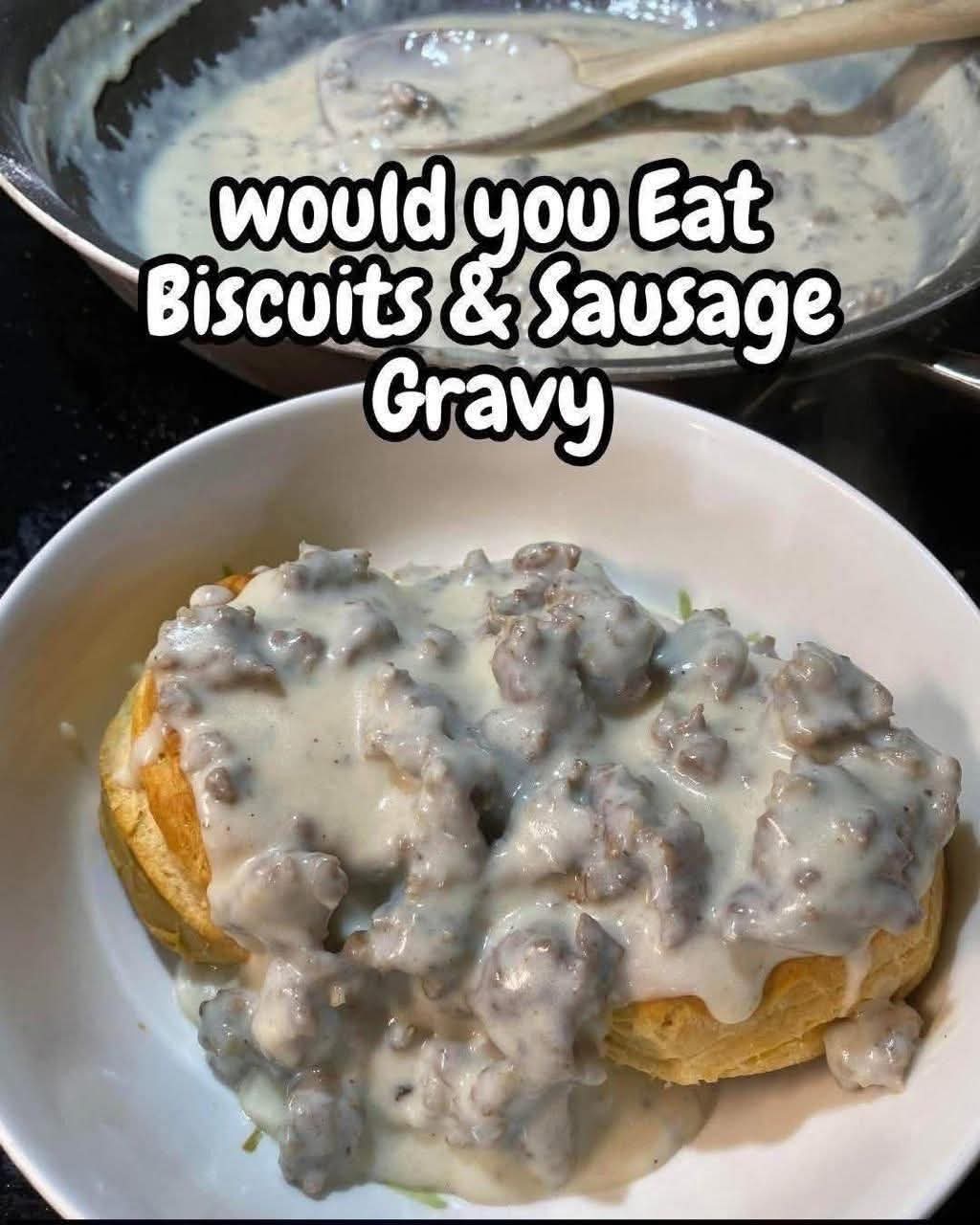 Split warm biscuits and spoon sausage gravy generously over the top.