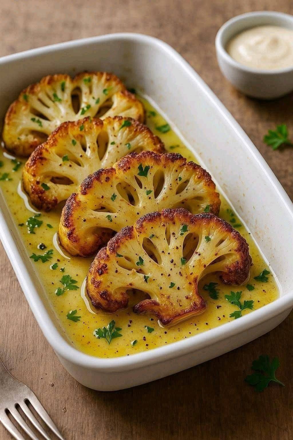 STEP 1: PREHEAT THE OVENPreheat your oven to 425°F (220°C). Line a large baking sheet with parchment paper or a silicone baking mat for easy cleanup and to prevent sticking.STEP 2: PREPARE THE CAULIFLOWERWash the cauliflower thoroughly and pat it dry with a kitchen towel.Cut the cauliflower into bite-sized florets, ensuring they are evenly sized for uniform cooking.STEP 3: COAT THE CAULIFLOWERIn a large bowl, toss the cauliflower florets with olive oil, making sure they are evenly coated.In a separate small bowl, mix the breadcrumbs, Parmesan cheese (if using), garlic powder, smoked paprika, salt, and black pepper.Sprinkle the breadcrumb mixture over the cauliflower and toss until all florets are well-coated. Press the coating gently onto the florets for better adherence.STEP 4: ARRANGE ON THE BAKING SHEETSpread the coated cauliflower florets in a single layer on the prepared baking sheet. Make sure the florets are not overcrowded to allow even roasting.STEP 5: ROAST THE CAULIFLOWERRoast the cauliflower in the preheated oven for 20-25 minutes, turning the florets halfway through to ensure even browning.The cauliflower is done when it is golden brown and crispy on the edges. If desired, broil for an additional 2-3 minutes for extra crispiness.STEP 6: PREPARE THE DIPPING SAUCE (OPTIONAL)While the cauliflower is roasting, prepare the dipping sauce by mixing mayonnaise or Greek yogurt, hot sauce, honey, garlic powder, salt, and pepper in a small bowl.Adjust the seasoning to taste and refrigerate until ready to serve.STEP 7: SERVE AND ENJOYRemove the roasted cauliflower from the oven and let it cool for a couple of minutes.Serve immediately with the dipping sauce or your favorite condiments.Enjoy!