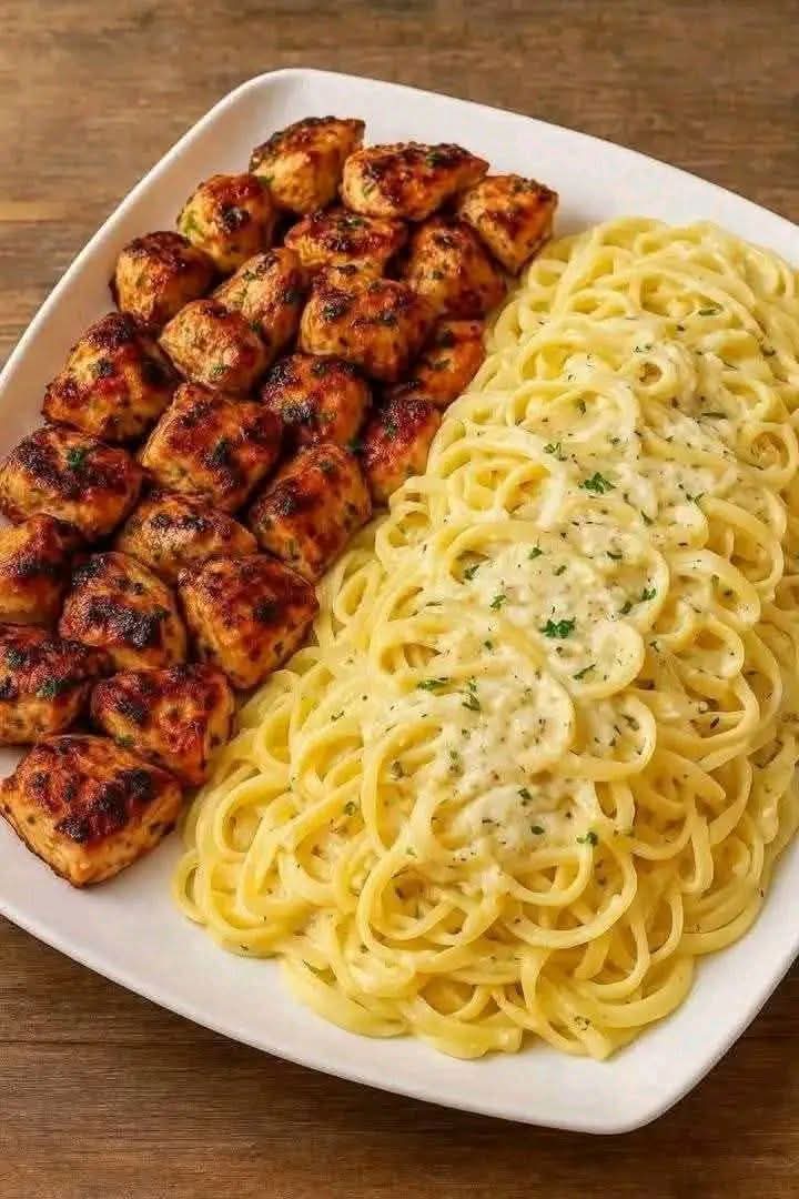 Here’s a delicious and easy recipe for Grilled Chicken Bites with Creamy Garlic Sauce — juicy, flavorful chicken served with a rich, garlicky dipping sauce. Perfect as an appetizer, snack, or light meal!🍗 Grilled Chicken Bites with Creamy Garlic Sauce🔥 Servings: 4 | Prep Time: 15 mins | Cook Time: 15 mins✅ IngredientsFor the Chicken Bites:2 large boneless, skinless chicken breasts (or thighs), cut into bite-sized cubes2 tbsp olive oil1 tbsp lemon juice3 cloves garlic, minced1 tsp smoked paprika (or regular)1 tsp dried oregano1/2 tsp black pepper1/2 tsp saltFor the Creamy Garlic Sauce:3 tbsp butter4 cloves garlic, minced or finely grated1 cup heavy cream (or half-and-half for lighter version)1/4 cup grated Parmesan cheeseSalt & pepper to taste1 tbsp chopped parsley (optional, for garnish)🧑🍳 Instructions🔥 Grill the Chicken Bites:Marinate:In a bowl, mix olive oil, lemon juice, garlic, paprika, oregano, salt, and pepper. Add chicken and toss to coat. Let it marinate for at least 15 minutes (or up to 1 hour in the fridge for deeper flavor).Grill or Pan-Sear:Heat a grill pan or skillet over medium-high heat. Add the chicken pieces and cook for 3–4 minutes per side or until golden and cooked through. Remove and keep warm.🧄 Make the Creamy Garlic Sauce:Sauté Garlic:In a small saucepan, melt the butter over medium heat. Add minced garlic and sauté until fragrant (about 1 minute).Add Cream & Cheese:Stir in the heavy cream and bring to a gentle simmer. Add Parmesan and stir until melted and smooth.Season:Add salt and pepper to taste. Simmer until slightly thickened (2–3 minutes). If too thick, thin with a splash of milk.🍽️ To Serve:Drizzle the creamy garlic sauce over the grilled chicken bites, or serve it on the side as a dipping sauce.Garnish with chopped parsley or extra Parmesan if desired.Great with rice, roasted veggies, or over salad greens.🔄 Variations:Spicy Version: Add chili flakes to the marinade or sauce.Low-carb/keto: Serve with cauliflower rice or steamed greens.Dairy-free: Use coconut cream and nutritional yeast instead of cream and cheese.