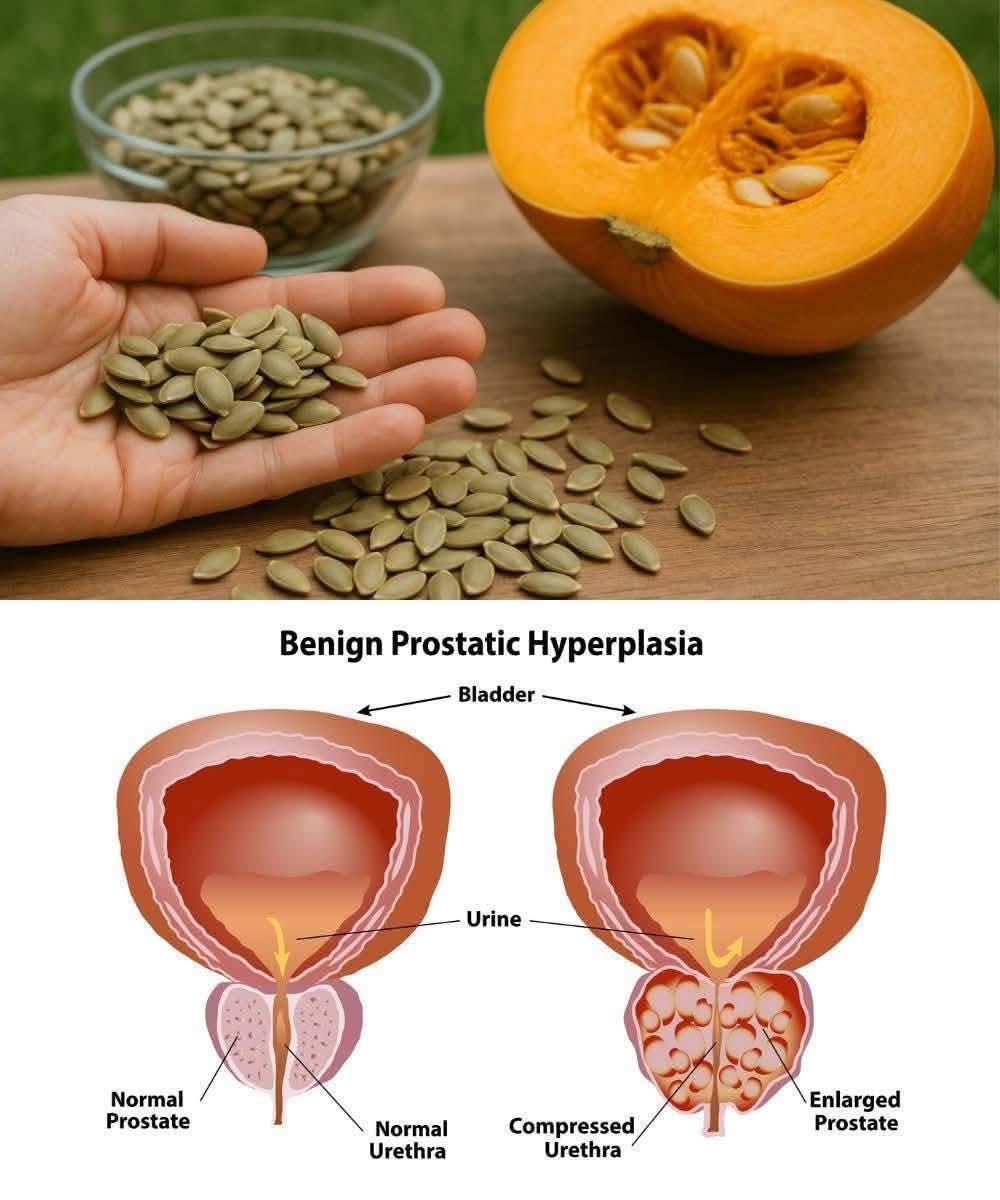 Pumpkin seeds — also known as semillas de auyama in Latin America — are small but mighty. For centuries, they’ve been used in traditional medicine as a natural remedy to support men’s health. Packed with antioxidants, healthy fats, minerals, and plant compounds, these tiny seeds are now backed by modern research for their ability to reduce prostate inflammation, improve urinary flow, and promote hormonal balance.If you’re over 40 or simply looking to protect your prostate and overall wellness, adding pumpkin seeds to your daily routine is a simple, tasty, and powerful choice. Below, you’ll discover easy home remedies, recipes, nutritional highlights, benefits, and precautions to make the most of this natural superfood.🌿 4 Easy Pumpkin Seed Remedies for Prostate Health1. Pumpkin Seed Infusion (Tea)Ingredients:2 tablespoons of unsalted pumpkin seeds1 liter of waterPreparation:Wash and lightly crush the seeds.Boil the water, add seeds, and simmer on low heat for 15 minutes.Strain and enjoy hot or chilled.How to use:Drink 1 cup in the morning and another before bedtime for 14 days. This soothing tea can help reduce prostate swelling and improve urinary function.2. Pumpkin Seed & Pineapple SmoothieIngredients:½ cup pumpkin seeds1 cup fresh pineapple chunks1 cup coconut water1 teaspoon honey (optional)Preparation:Soak pumpkin seeds in water for 4 hours.Blend with pineapple and coconut water until smooth.Add honey if desired and drink fresh.How to use:Take one glass daily on an empty stomach for 10 days. This tropical smoothie reduces inflammation, boosts immunity, and supports digestion.3. Homemade Pumpkin Seed OilIngredients:2 cups pumpkin seeds1 cup extra virgin olive oilPreparation:Lightly toast seeds over low heat.Grind them into a coarse mixture.Mix with olive oil in a dark glass jar.Let it rest for 7 days, then strain and store.How to use:Take 1 teaspoon daily on an empty stomach, or drizzle over salads. Rich in antioxidants and healthy fats, this oil supports hormonal balance and prostate wellness.4. Pumpkin Seed CookiesIngredients:1 cup whole wheat flour½ cup ground pumpkin seeds¼ cup honey1 egg2 tablespoons coconut oilPreparation:Mix all ingredients into a dough.Shape into small cookies and flatten slightly.Bake at 180 °C (350 °F) for 15 minutes until golden.How to use:Enjoy 2 cookies daily as a healthy snack for 3 weeks. A delicious way to incorporate pumpkin seeds into your routine.💪 Key Benefits of Pumpkin SeedsPumpkin seeds aren’t just snacks — they’re functional foods with proven benefits, especially for men’s health:Reduce prostate inflammationImprove urinary flowHelp prevent prostate enlargement (BPH)Support cardiovascular and heart healthLower bad cholesterol (LDL)Strengthen the immune systemImprove sleep quality (thanks to tryptophan)Promote healthy digestionBoost energy and staminaEnhance skin, nails, and hair healthBalance male hormonesProtect against oxidative stressStrengthen bones and jointsAid in healthy weight management🥗 Nutritional ProfilePumpkin seeds are nutrient-dense and loaded with compounds essential for men’s health:Zinc: Crucial for prostate health, fertility, and immune strength.Magnesium: Supports nerves, heart, and muscle function.Healthy fats (omega-3 & omega-6): Protect cardiovascular and nervous systems.Antioxidants (carotenoids & vitamin E): Combat free radicals.Tryptophan: Improves sleep and mood.⚠️ Safety and PrecautionsWhile generally safe, keep these tips in mind:Consult a doctor if you’re under medical treatment or have kidney issues.Avoid overconsumption, as it may cause digestive discomfort.Do not eat if allergic to seeds or nuts.Keep away from small children due to choking risk.✅ Final ThoughtsPumpkin seeds (semillas de auyama) are far more than just a crunchy snack — they’re a natural ally for prostate health, hormonal balance, and overall wellness. Whether you sip them as a tea, blend them in a smoothie, enjoy them in cookies, or prepare oil, pumpkin seeds offer an easy and effective way to care for your body.By making them part of your daily routine, you’re taking a proactive step toward long-term prostate health and a healthier, more balanced life.