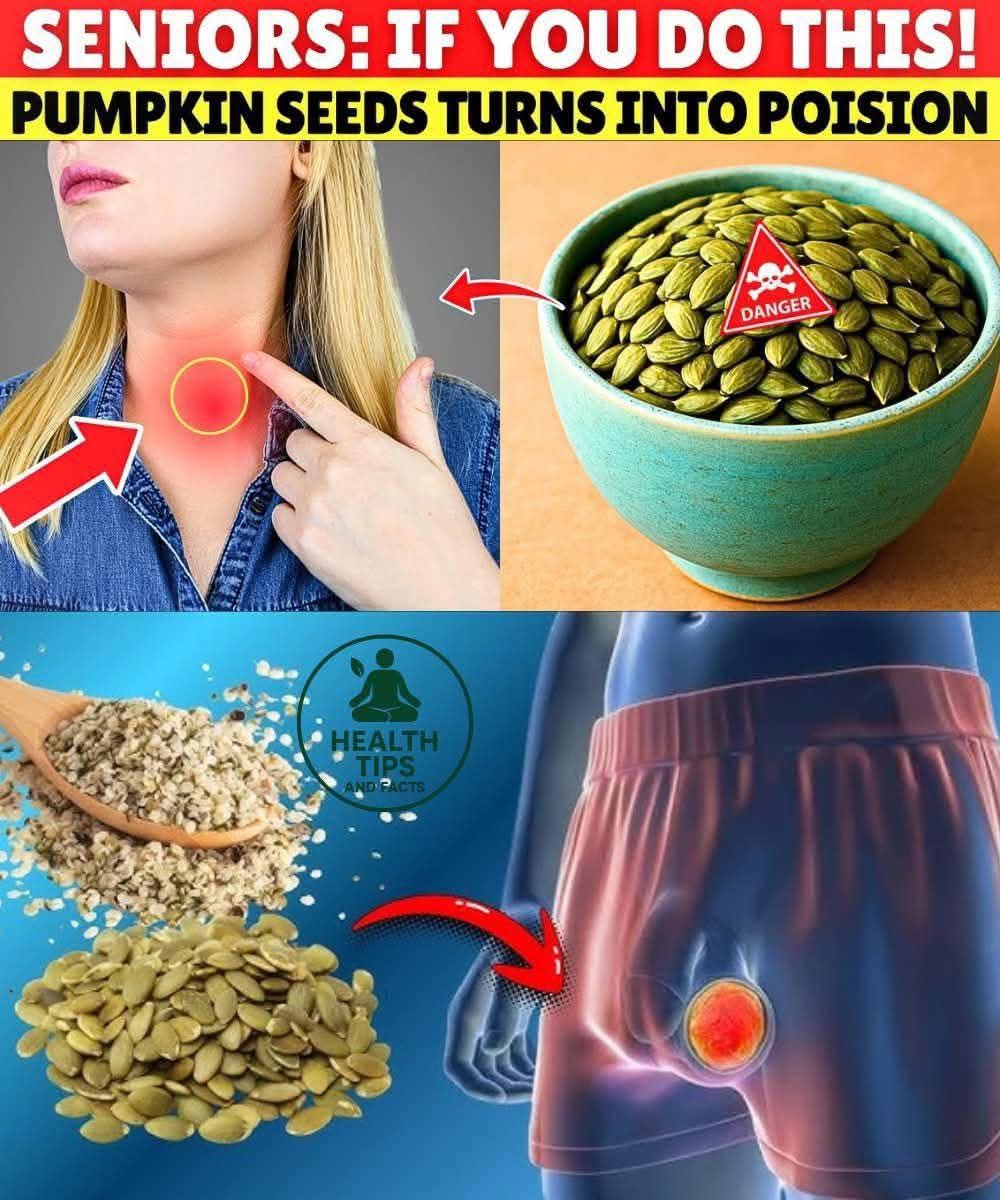 Pumpkin seeds, also known as pepitas, are small but mighty — packed with zinc, magnesium, antioxidants, and omega-3s. They’re great for heart health, prostate support, and better sleep.However, for seniors, eating them the wrong way or in excess can cause serious side effects that few people talk about.Here are 8 hidden pumpkin seed dangers you need to know before your next snack!1. Can Trigger Digestive ProblemsPumpkin seeds are high in fiber and fat, which can be too heavy for older digestive systems.Eating too many can cause:BloatingGasConstipation or diarrheaTo avoid this, limit intake to a small handful (1–2 tablespoons) daily and always chew them well.2. May Increase Risk of Stomach PainRaw pumpkin seeds can be hard to digest due to their tough outer shell.For seniors with weaker digestion or gallbladder issues, this can lead to cramping or discomfort.Tip: Lightly roast or soak seeds before eating to make them easier on your stomach.3. Can Aggravate Low Blood PressurePumpkin seeds have mild blood-pressure-lowering effects due to magnesium.If you’re already taking blood pressure medication, combining both can cause dizziness, fatigue, or fainting.Always check with your doctor before eating pumpkin seeds regularly.4. May Interfere With Prostate or Urinary MedicationsPumpkin seeds are often promoted for prostate health, but they can interact with diuretics or hormonal drugs.This might reduce medication effectiveness or cause dehydration.Seniors should consult a healthcare professional before adding them to their daily supplement list.5. Can Trigger Allergic ReactionsAlthough rare, some people develop allergies to pumpkin seeds — symptoms may include:Itchy throatSwelling of lips or tongueSkin rashDifficulty breathingIf any of these appear, stop consuming immediately and seek medical help.6. Possible Weight Gain from OvereatingPumpkin seeds are nutrient-dense but high in calories and fats.One cup contains nearly 700 calories!For seniors who are less active, excessive consumption may lead to unwanted weight gain or increase cholesterol levels.7. May Contain Harmful Oils if Improperly StoredPumpkin seed oil oxidizes quickly. When exposed to heat or light, it can turn rancid and release toxic compounds.Always store seeds and oil in dark, airtight containers, away from sunlight.8. Can Cause Constipation if Not Enough Water Is ConsumedThe fiber in pumpkin seeds needs adequate hydration to move smoothly through the intestines.Without enough water, it can have the opposite effect — leading to hard stools and constipation.Drink at least 6–8 glasses of water daily if you eat seeds regularly.💡 Pro Tips for Seniors✅ Choose organic, roasted (not fried) pumpkin seeds.✅ Avoid flavored or salted versions high in sodium.✅ Eat in moderation — about 1 oz (28g) per day.✅ Combine with softer foods like yogurt or oatmeal for easier digestion.Final ThoughtsPumpkin seeds are indeed healthy — but for seniors, moderation and preparation are everything.Eating them in excess or with certain medications can backfire, turning a superfood into a potential hazard.So enjoy them smartly, keep your portions small, and listen to your body.