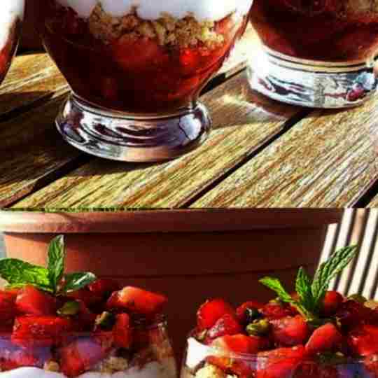 – In serving glasses or bowls, start by adding a layer of the strawberry mixture at the bottom.
